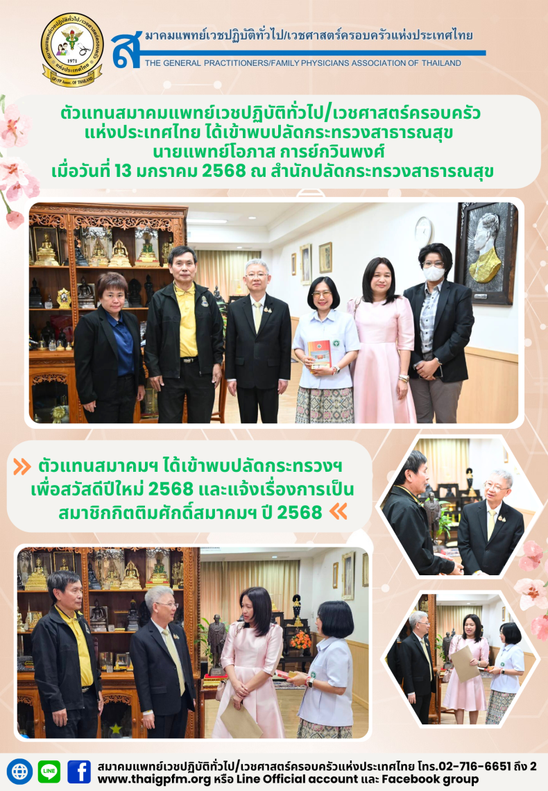 สมาคมแพทย์เวชปฏิบัติทั่วไป/เวชศาสตร์ครอบครัวแห่งประเทศไทย ได้เข้าพบปลัดกระทรวงสาธารณสุข นายแพทย์โอภาส การย์กวินพงศ์ 17 มกราคม 256820 มกราคม 2025 สมาคมเวชปฏิบัติทั่วไป/เวชศาสตร์ครอบครัวแห่งประเทศไทย ข่าวสาร, ข่าวสารล่าสุด, จดหมายข่าว ตัวแทนสมาคมฯ ได้เข้าพบปลัดกระทรวงฯ นายแพทย์โอภาส การย์กวินพงศ์ เพื่อสวัสดีปีใหม่ 2568 และแจ้งเรื่องการเป็นสมาชิกกิตติมศักดิ์สมาคมฯ ปี 2568 เมื่อวันที่ 13 มกราคม 2568 ณ สำนักปลัดกระทรวงสาธารณสุข สมาคมเวชปฏิบัติทั่วไป/เวชศาสตร์ครอบครัวแห่งประเทศไทย จดหมายข่าว สมาชิกกิตติมศักดิ์