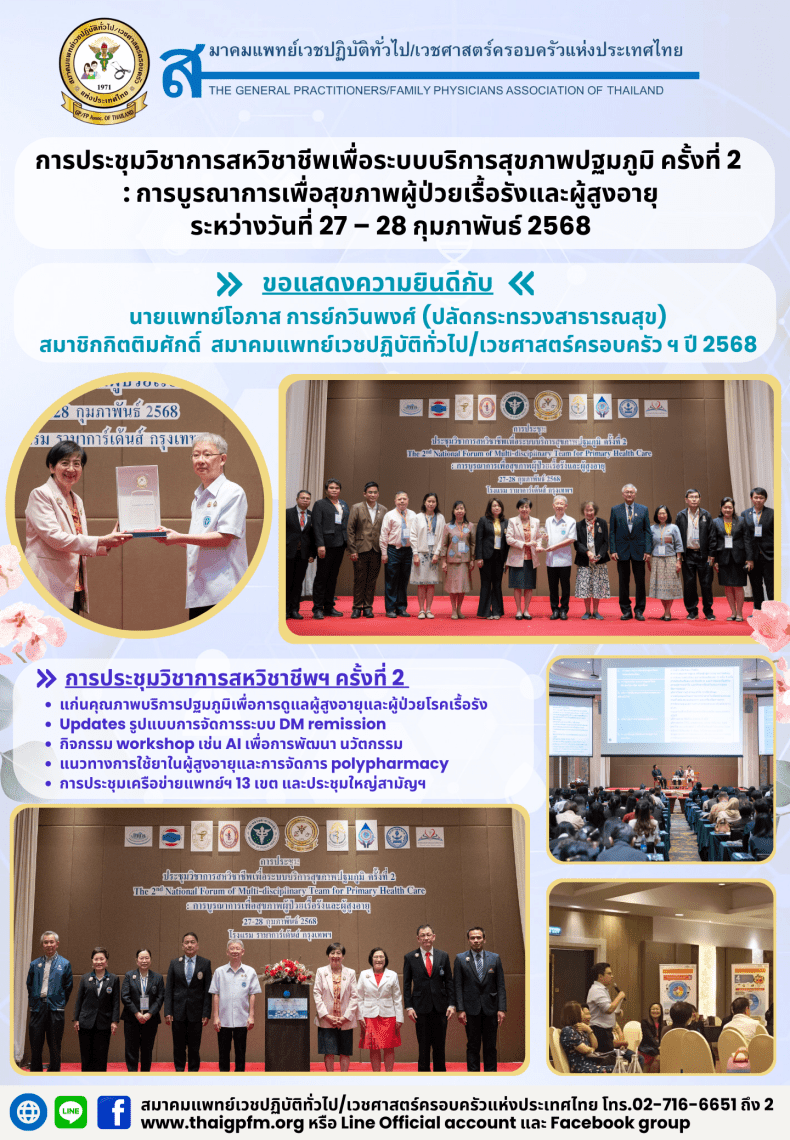 การประชุมวิชาการสหวิชาชีพเพื่อระบบบริการสุขภาพปฐมภูมิ ครั้งที่ 2 : การบูรณาการเพื่อสุขภาพผู้ป่วยเรื้อรังและผู้สูงอายุ 3 มีนาคม 25683 มีนาคม 2025 สมาคมเวชปฏิบัติทั่วไป/เวชศาสตร์ครอบครัวแห่งประเทศไทย การอบรมและประชุมวิชาการ, ข่าวสาร, ข่าวสารล่าสุด, จดหมายข่าว The 2nd National Forum of Multi-disciplinary Team for Primary Health Careระหว่างวันที่ 27 – 28 กุมภาพันธ์ 2568 ณ โรงแรม รามาการ์เด้นส์ กรุงเทพฯ สมาคมเวชปฏิบัติทั่วไป/เวชศาสตร์ครอบครัวแห่งประเทศไทย จดหมายข่าว ประชุมวิชาการ