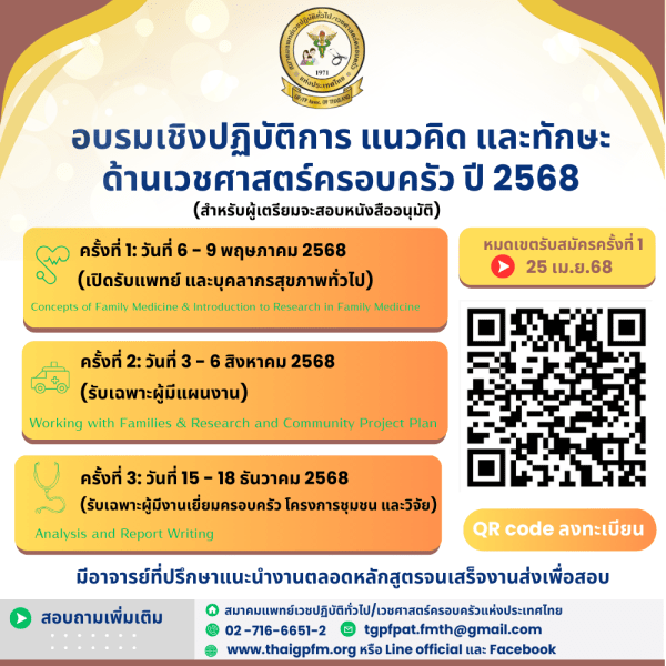 โครงการอบรมเชิงปฏิบัติการแนวคิด และทักษะด้านเวชศาสตร์ครอบครัว ปี 2568 สำหรับผู้เตรียมจะสอบหนังสืออนุมัติ (อว.) 10 กุมภาพันธ์ 25681 พฤษภาคม 2025 ข่าวสาร, ข่าวสารล่าสุด หมดเขตรับสมัครแล้ว ติดต่อสอบถามที่ นพ.กอปรชุษณ์ ตยัคคาน […] สมาคมเวชปฏิบัติทั่วไป/เวชศาสตร์ครอบครัวแห่งประเทศไทย10 กุมภาพันธ์ 2568