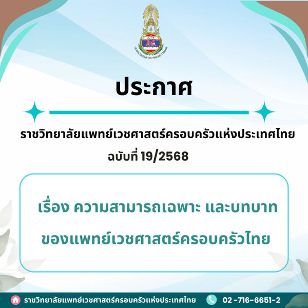 ประกาศราชวิทยาลัยฯ เรื่อง ความสามารถเฉพาะ และบทบาทของแพทย์เวชศาสตร์ครอบครัวไทย 28 พฤษภาคม 256828 พฤษภาคม 2025 ข่าวสาร, ข่าวสารล่าสุด ประกาศราชวิทยาลัยแพทย์เวชศาสตร์ครอบครัวแห่งประเทศไทย ฉบ […] สมาคมเวชปฏิบัติทั่วไป/เวชศาสตร์ครอบครัวแห่งประเทศไทย28 พฤษภาคม 2568