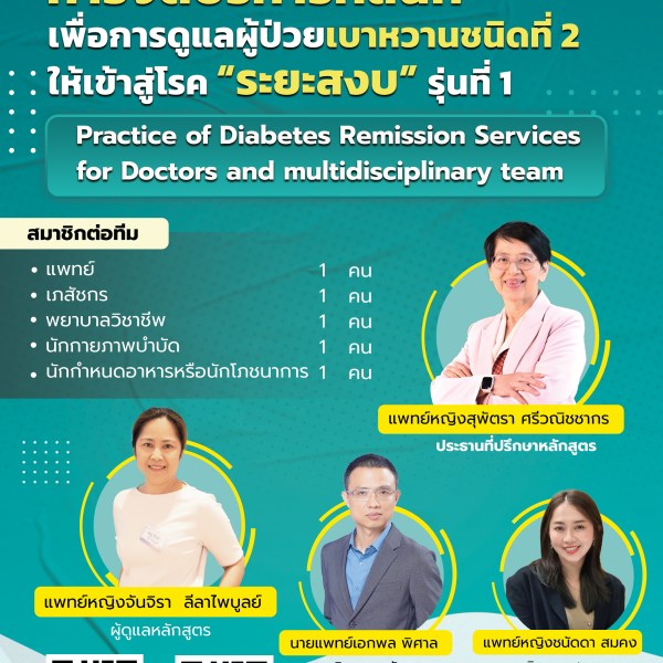 หลักสูตรอบรมระยะสั้นสำหรับทีมสหวิชาชีพ การจัดบริการคลินิกเพื่อการดูแลผู้ป่วยเบาหวานชนิดที่ 2 ให้เข้าสู่โรค “ระยะสงบ” รุ่นที่ 1 30 ตุลาคม 256731 ตุลาคม 2024 ข่าวสาร, ข่าวสารล่าสุด สมัครได้ที่ QR-code หรือ link นี้ >>> https://forms.gle […] สมาคมเวชปฏิบัติทั่วไป/เวชศาสตร์ครอบครัวแห่งประเทศไทย30 ตุลาคม 2567